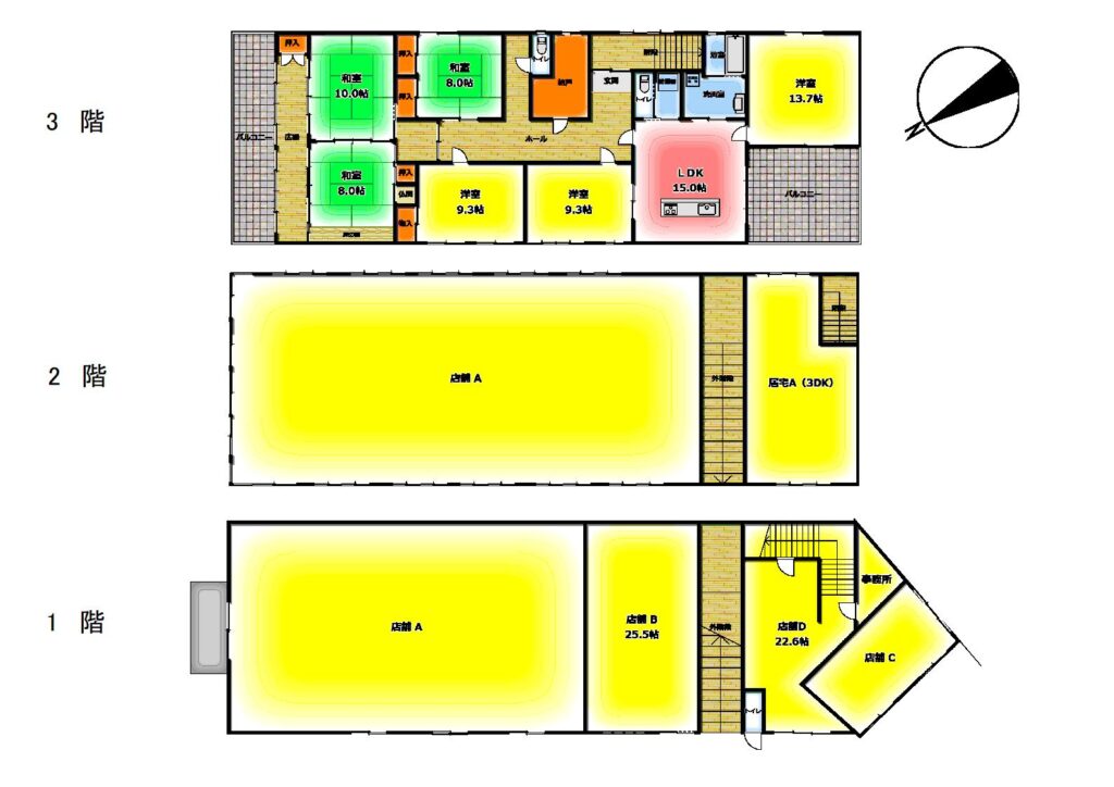 ◆店舗Aの室内には1階と2階を繋ぐエレベーターがあり、同じ企業様が契約しておられます。 ◆南側の店舗C(元無人餃子屋)は現在は空室です。 ◆3階居宅は6LDKでお引き渡し後に空室となりますので居住または賃貸可能です。3階居宅用の駐車場は2台分あります。 ◆店舗Dは3階居宅への室内階段がありますので単独で賃貸することは難しいです。3階居宅には、3階に独立した玄関がありますので、階段の架け替えを行うことで店舗Dを単独の店舗にリフォームすることも可能です。 現況のまま使用されるなら、3階入居者用の倉庫、店舗、事務所としてご使用になれます。 ◆2階「居宅」の造りは3DKの居住用ですが、現在は店舗として賃貸しています。 ◆店舗C・店舗D・事務室は元々一つの店舗だった為、壁を抜いて元に戻すリフォームも可能です。